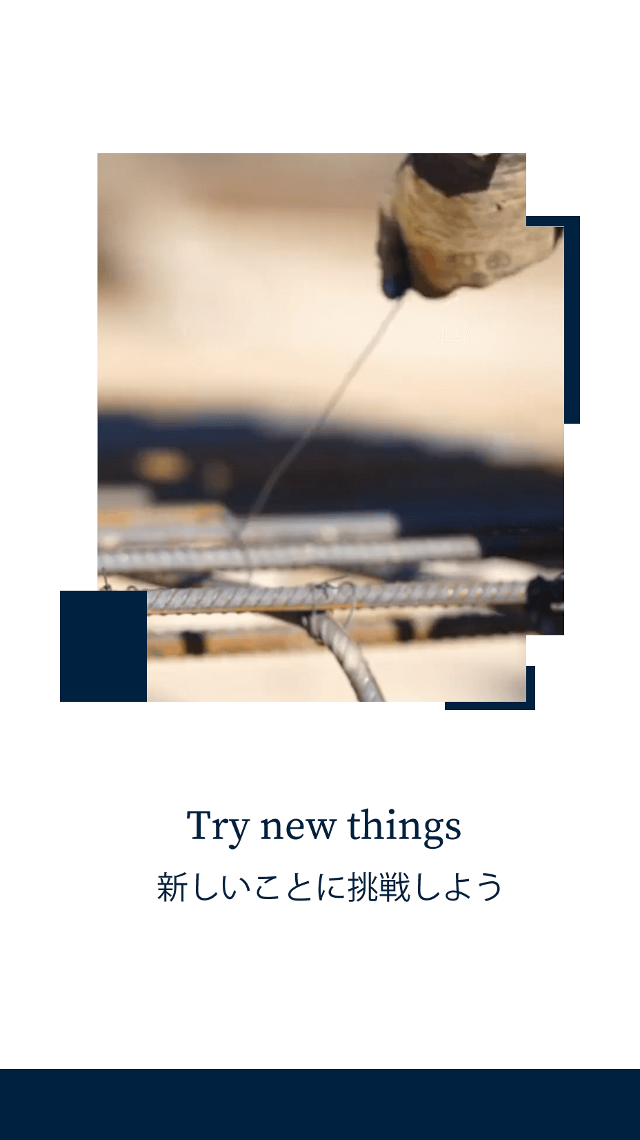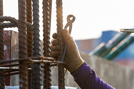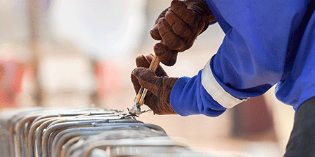 「ハッカー」と呼ばれる工具と結束線を使って、鉄筋の交差部を縛る作業です。しっかりと結束することによって、骨組みの強度が増します。